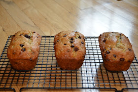But when I was reading A Homemade Life, which I've mentioned in an earlier post, I knew I wanted to try the recipe for "banana bread with chocolate and crystallized ginger."  I adapted the recipe by eliminating the crystallized ginger altogether.  While it's probably a great combination of spice and added texture against the chocolate, I know my young son wouldn't be into it.  Instead, I decided to substitute with a little bit (3/4 teaspoon but you could use more if you're not concerned about young sensitive taste buds ) of ground ginger.